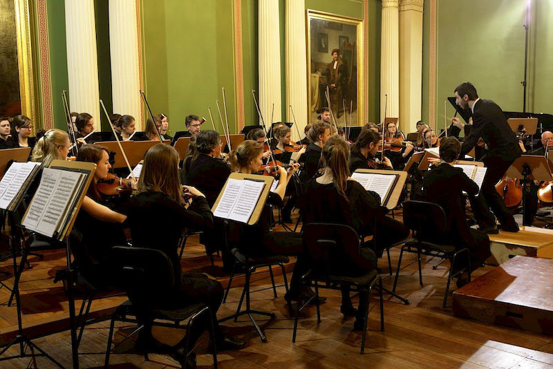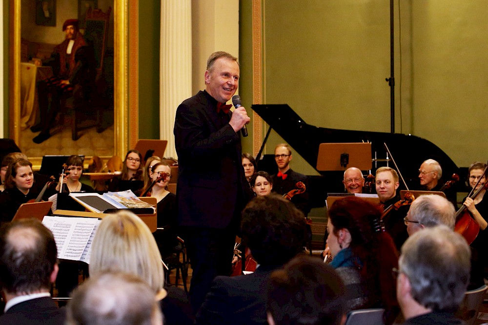 Einen krönenden Abschluss fand der Abend für viele Besucher beim Neujahrskonzert im Löwengebäude. In der vollbesetzten Aula begeisterte das Akademische Orchester der Universität unter Leitung von Matthias Erben mit zwei renommierten Gästen der Hochschule für Musik Franz Liszt Weimar. In wechselnder Besetzung geben die Musiker Stücke von Antonín Leopold Dvorák, Eugène-Auguste Ysaÿe, Wolfgang Amadeus Mozart, Joseph-Maurice Ravel, Philippe Gaubert und Pjotr Iljitsch Tschaikowsky zum Besten.
