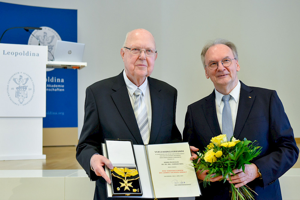 „Es gibt viel mehr Träger von Bundesverdienstorden als des Landesverdienstordens“, stellte Ministerpräsident Dr. Reiner Haseloff am Mittwochnachmittag im Festsaal der Nationalakademie Leopoldina fest. Es sei eine besondere Auszeichnung für einen besonders engagierten Forscher, der weit über sein Fach, die Physik, hinaus wirkt: „Mit Ihnen ehren wir heute einen hochrangigen Wissenschaftler, der sich hervorragende Verdienste um den Wissenschaftsstandort Sachsen-Anhalt erworben hat“, sagte Haseloff an Berg gewandt.
