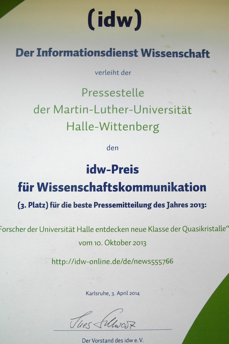 Der Text über die Entdeckung einer neuen Klasse von Quasikristallen durch das Team um Prof. Dr. Wolf Widdra gehört für die Jury zu den drei besten deutschsprachigen Pressemitteilungen des Jahres 2013. 77 Pressestellen aus Deutschland, Österreich und der Schweiz hatten sich um den Preis beworben. Die eingesandten Texte wurden von einer Fach-Jury nach handwerklicher Professionalität, Nachrichtenwert und wissenschaftlicher Bedeutung bewertet.