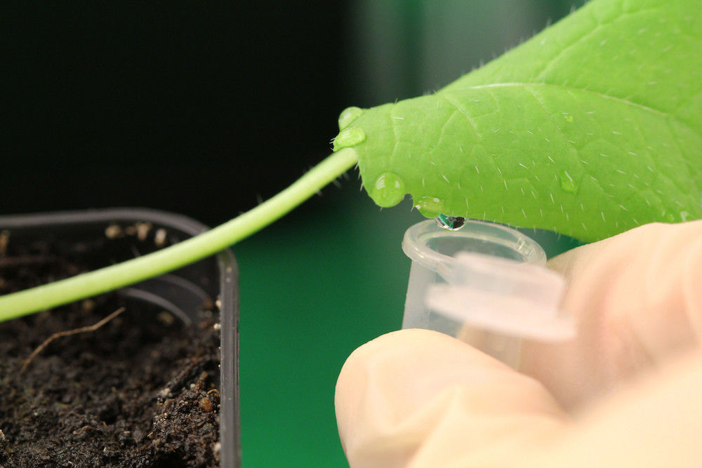 Die Acker-Schmalwand ist ein sehr dankbares Versuchsobjekt, denn ihr Erbgut ist nicht sehr komplex und sehr gut erforscht. Sie produziert jedoch keine relevanten Mengen an Guttationsflüssigkeit, wächst nur sehr langsam und ist klein. Die Mairübchen hingegen produzieren schon größere Mengen, innerhalb mehrerer Tage sind es etwa fünf Milliliter pro Pflanze. Doch die Forscher suchen weiter nach ertragreichen Pflanzen, deren Erbgut sich gut verändern lässt und die möglichst häufig und viel Guttation betreiben. Im Gewächshaus stehen beispielsweise Taro-Pflanzen, die bis zu 100 Milliliter pro Blatt erzeugen können, sowie eine Senfpflanze, die Schattat von einem Forscher in Wisconsin zugesandt bekommen hat. Letztere ist besonders vorteilhaft, weil sie sich selbst bestäubt. Ein zur Proteinproduktion präparierter Senf ließe sich damit schnell und erfolgssicher vermehren.