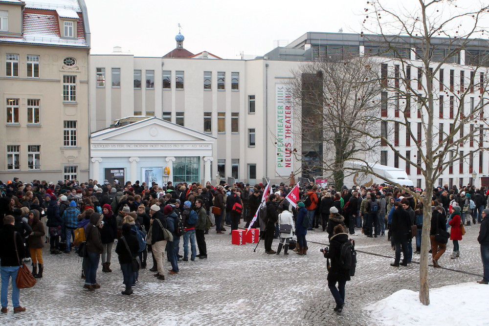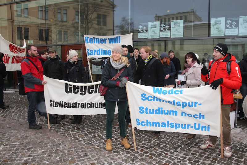 Deborah Will gehörte zu den Studenten, die trotz der Kälte vor dem Audimax standen, um gegen Einsparpläne zu protestieren. „Ich hoffe, dass die Demo Wirkung zeigt. Schon jetzt sind alle Veranstaltungen überfüllt“, sagte die Studentin der Soziologie und Politikwissenschaften. „Wenn Stellen gekürzt werden, dann wird das nur noch schlimmer. Auch wenn mein Studiengang nicht direkt von Kürzungen betroffen sein sollte, will ich Solidarität mit den anderen Fächern zeigen.“