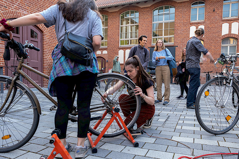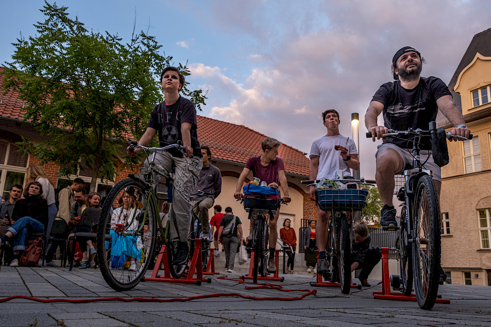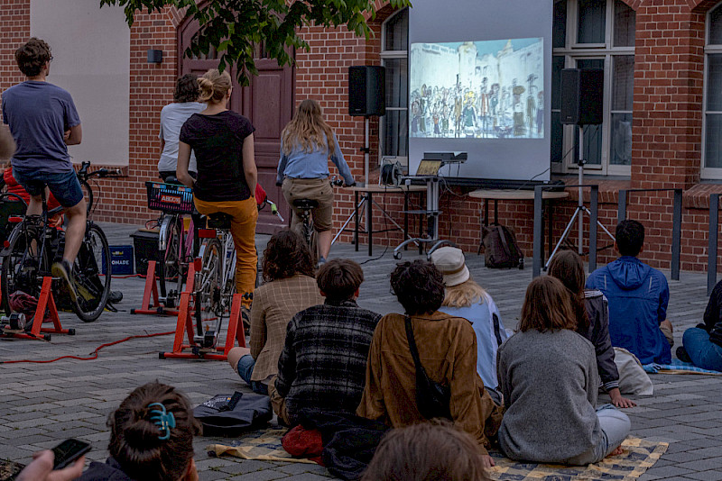 Filme, Fahrrad, frische Luft: Gestern Abend machte das Fahrradkino Station am Steintor-Campus. Hier konnten Gäste am eigenen Leib erfahren, was es bedeutet, mit Muskelkraft den Strom für Projektor und Lautsprecher zu erzeugen. Die zahlreichen internationalen Kurzfilme, thematisch an der Academic Bicycle Challenge orientiert, begeisterten über 90 Besucherinnen und Besucher. Von Frederik Bub vom Nachhaltigkeitsbüro der MLU wurden sie mit einer spannenden Frage begrüßt: „Wieviele Menschen benötigt man, um die gesamte Universität per Fahrrad mit Strom zu versorgen?“ Die Auflösung: Es sind 70.000, wenn sie zehn Stunden am Tag nur radeln würden.