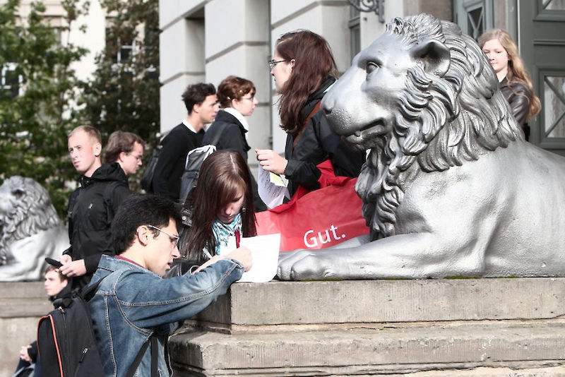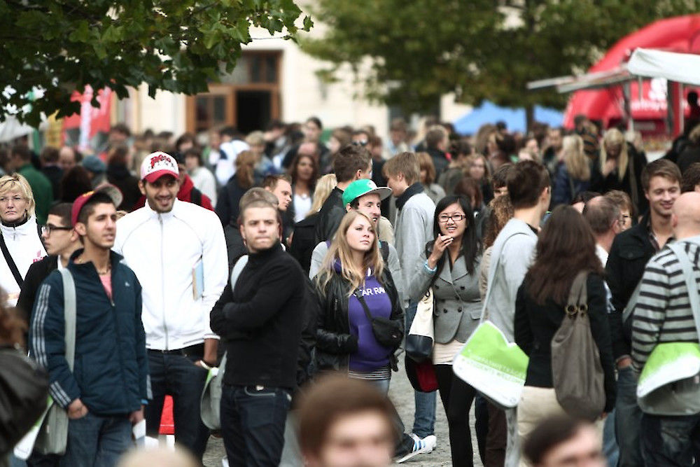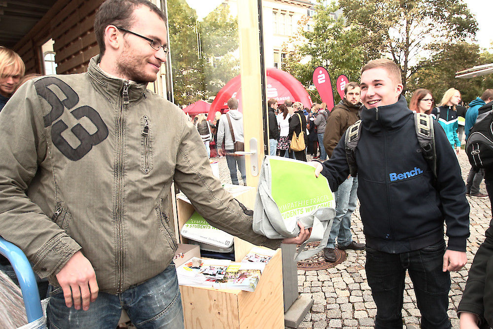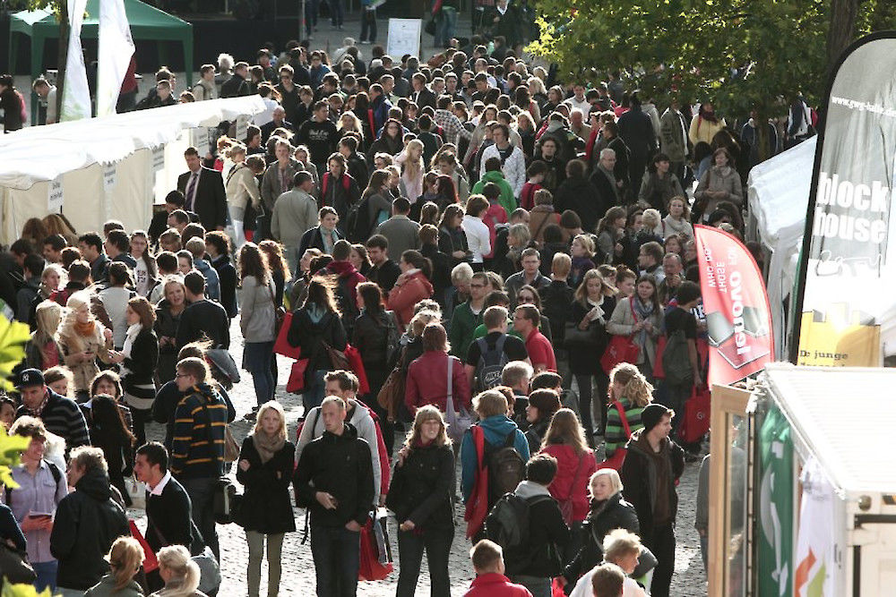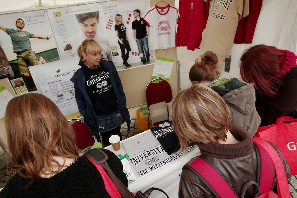 Überall herrschte an diesem Tag Hochbetrieb: An den Info-Ständen und vor der Bühne auf dem Uniplatz, bei der Studienberatung im Löwengebäude, in den Hörsaalen und im Uni-eigenen Container, in dem die letzten Welcome Bags an Erstsemester verteilt wurden. Im Namen der Stadt hieß auch Wolfram Neumann, Beigeordneter für Wirtschaft und Arbeit, die "Erstis" in Halle willkommen. Im Festvortrag sprach Angela Papenburg, Geschäftsführerin der Günther Papenburg AG, über Formen der praxisnahen Ausbildung von Studierenden.