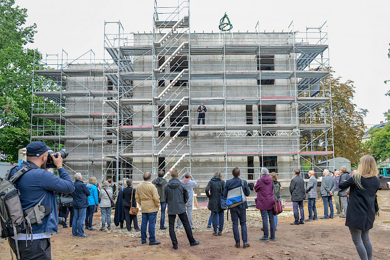 Dort, wo jetzt noch ein fertiger Rohbau steht, soll ab dem kommenden Jahr in hochmodernen Laboren ökologische und systematische Forschung im Bereich der Biodiversität betrieben werden. Mit dem Laborneubau werde etwas ganz Besonderes geschaffen, sagte Wissenschaftsminister Prof. Dr. Armin Willingmann in seinem Grußwort auf dem Richtfest. Er betonte nicht nur die lange Tradition botanischer und ökologischer Forschung in Halle, die bis ins Jahr 1698 – das Gründungsjahr des Botanischen Gartens - zurückreiche. Willingmann verwies auch auf die heutige Beteiligung der Universität am Deutschen Zentrum für integrative Biodiversitätsforschung (iDiv). Es gehe um nichts Geringeres als um den Klimawandel, um die Regeneration von Wäldern, um Anpassungsszenarien für eine Welt, in der die Temperaturen steigen. „Umso wichtiger ist, dass wir hier in Halle ganz vorne mit dabei sind.“