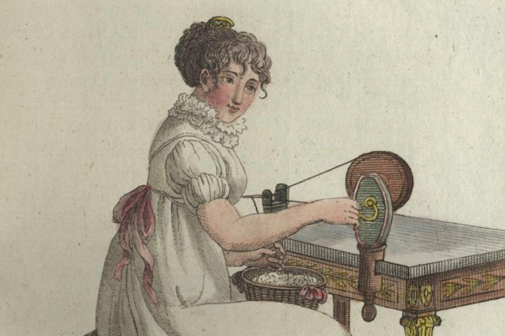 Den Grund dafür liefert wohl der Zeitgeist: In der Romantik boomte die Handarbeit, schlug sich zunehmend in Literatur und Bildern nieder. Sie wurde von der Pflicht zur Passion, das Ergebnis wurde weniger über den Gebrauchs-, sondern über den Kunstwert wahrgenommen. Im viel gelesenen „Journal des Luxus und der Moden“ konnte man elegante Spinnräder für den Salon bestellen. Noch während der Aufklärung war Handarbeit ein Disziplinierungsinstrument. Frauen wurden „beschäftigt“, um nicht zu viele Romane zu lesen und auf „dumme Gedanken“ zu kommen. Glaubte man. Erst in der Romantik, so Holm, setzte die Erkenntnis ein: Das stille Werkeln tut genau das Gegenteil, es setzt Fantasien frei. Handarbeit wurde poesiefähig.