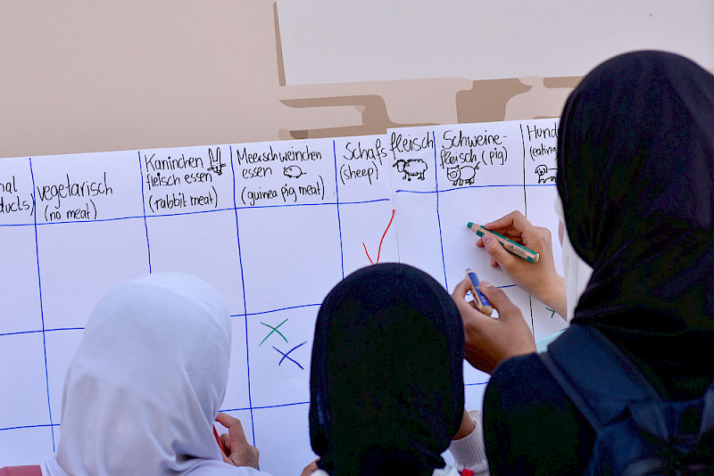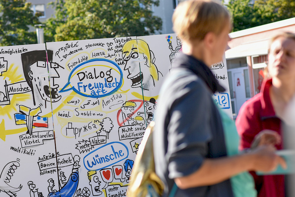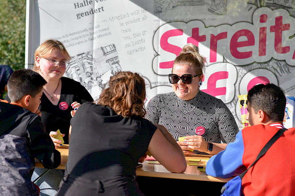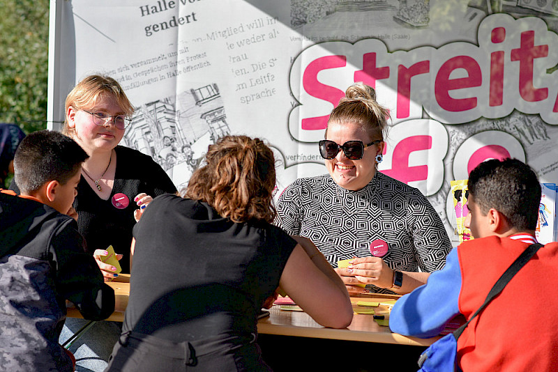 Monatelang hatten sie sich darauf vorbereitet, unzählige Gespräche geführt, ein Hörspiel eingesprochen, gemeinsam mit Partnern einiges auf die Beine gestellt: Bei ihrem „Streitfest“ sind Studierende der Sprechwissenschaft am Montag "Am Treff“ in Halle-Neustadt mit Anwohnerinnen und Anwohnern noch einmal dazu ins Gespräch gekommen, wie sie streiten und was Streitkultur für sie ausmacht. Jeden Montag hatten sich Eva Inselmann und Len Jakobsen im Vorfeld im Frühstückscafé der Arbeiterwohnfahrt mit Alteingesessenen und Zugezogenen getroffen. Zum Höhepunkt ihres Projekts, dem "Streitfest", konnten sich Besucherinnen und Besucher nun bei strahlendem Sonnenschein anhören, was andere über das Streiten sagen, aber auch selbst aktiv werden: Sie konnten zum Beispiel spielen, Bilder zum Thema malen, Erinnerungen aufschreiben. Das Fest fand im Rahmen des Themenjahres der Stadt Halle „Streitkultur und Zusammenhalt“ statt, als Kooperation der MLU-Studierenden mit dem Quartiersmanagement Halle-Neustadt, der GWG Halle-Neustadt und den kulturellen Themenjahren der Stadt Halle. "campus halensis" blickt in Bildern darauf zurück.