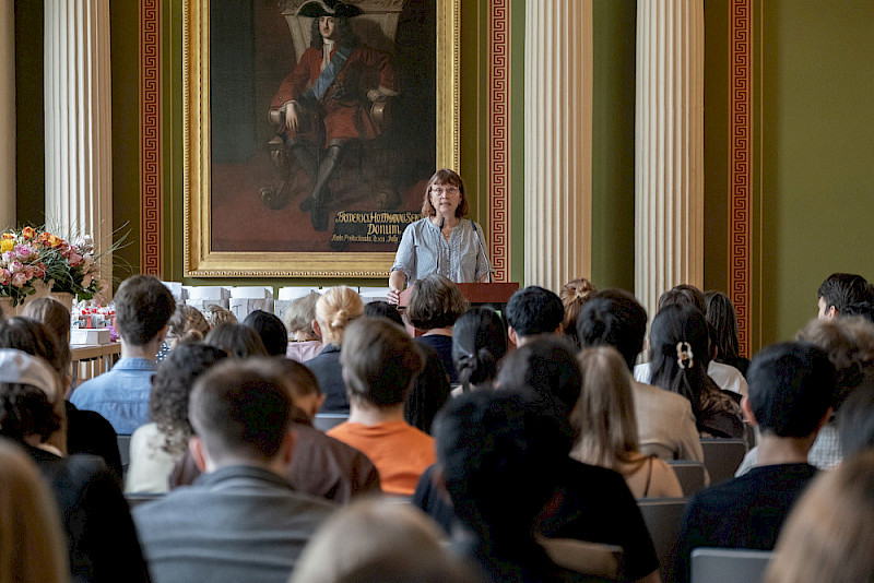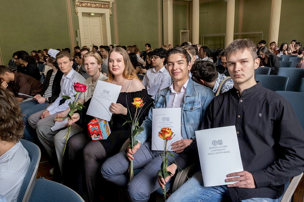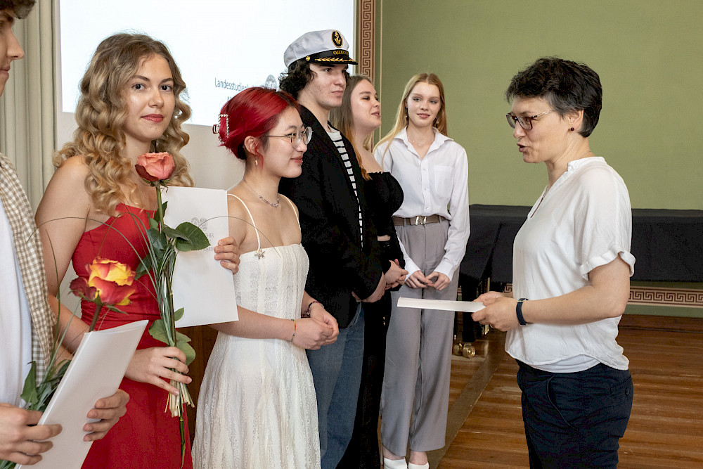 Dr. Katrin Krüger, Leiterin des Landesstudienkollegs, erinnerte sich bei ihrer Begrüßungsrede an eine Aussage, die sie selbst vor einigen Jahren bei ihrem Amtsantritt in Halle getroffen hat: „Ich finde alle Kollegiatinnen und Kollegiaten sehr mutig“, sagte sie – weil sie als junge Menschen die Herausforderung annehmen, ein Studium im Ausland zu absolvieren. Zur Zeugnisübergabe rief sie die Absolventinnen und Absolventen dazu auf, sich auch in einer Zeit von Kriegen und schwierigen politischen Verhältnissen nicht entmutigen zu lassen. „Sie sind auf Ihrem persönlichen, richtigen Weg. Sie haben viele, viele Chancen. Und wir sind natürlich alle davon überzeugt, dass Sie diese Chancen auch nutzen werden“, so Krüger.