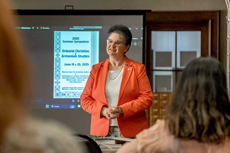 Die MLU wisse den Wert des MESROP-Zentrums in seiner wissenschaftlichen wie seiner kulturellen Dimension zu schätzen, sagte Rektorin Becker. Dessen fundierte Arbeit führe zu sichtbaren Erfolgen, zuletzt zur Etablierung einer neuen Buchreihe. Den ersten Band der Reihe übergab MESROP-Leiterin Prof. Dr. Cornelia Horn am Freitag der armenischen Botschaftsrätin Lusine Davtyan, die in Vertretung von Botschafter Viktor Yengibaryan vor Ort war. Davtyan sprach über die Bedeutung orientalischer, christlicher und armenischer Studien und dankte dem Land Sachsen-Anhalt und der MLU für die Unterstützung des MESROP-Zentrums.