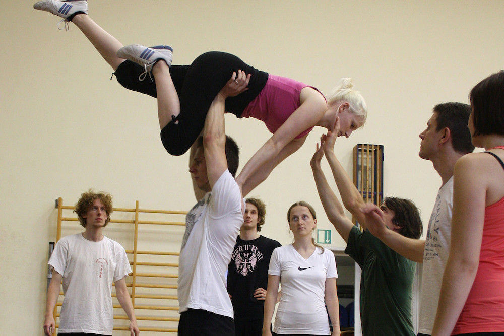 Kurz nachdem die Stunde begonnen hat, verteilen sich alle Pärchen in der Halle. Aus den Boxen erklingt Pop-Musik. Eine große Matte wird ausgerollt, auf der einige Teilnehmer Hebungen üben. Ich frage mich, was das mit Rock ’n’ Roll zu tun hat. Bin ich etwa im Turnkurs gelandet? Trainerin Jennifer Szczesny klärt mich auf: „Beim Rock-’n’-Roll-Tanz werden viele Akrobatiken eingebunden. Bei Turniertänzen zählt die Anzahl und Schwierigkeit der Elemente. Klassische Kleidung, also zum Beispiel Petticoats, tragen wir manchmal. Vorwiegend haben wir aber Showkleidung an.“ Sie selbst tanzt seit dem sie fünf Jahre alt ist, Rock ’n’ Roll lehrt sie an der MLU seit 2006.