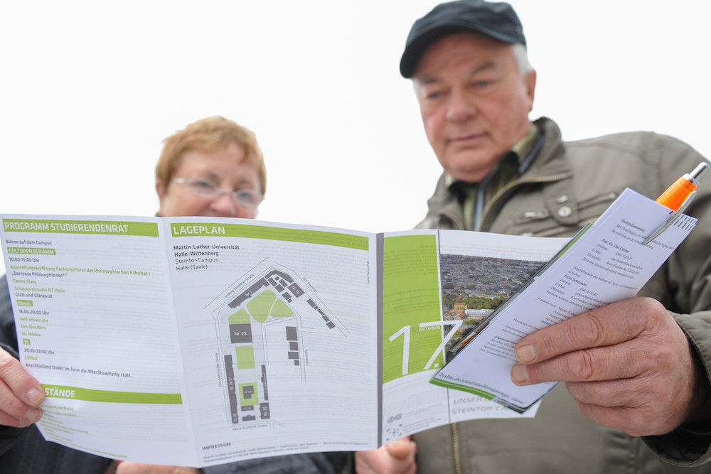Dr. Ralf-Torsten Speler, Präsident der Vereinigung der Freunde und Förderer der Uni Halle, führt Besuchergruppen über das Gelände. Auf dem Campus sorgt der Studierendenrat für ein abwechslungsreiches Bühnenprogramm mit Poetry Slammern und Schauspielern. Daneben präsentieren sich viele Hochschulgruppen und Uni-Einrichtungen.