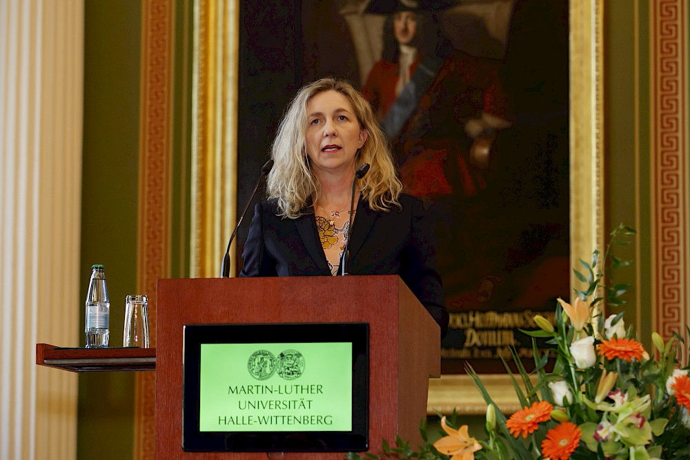Vor der Ehrung skizzierte die Festrednerin Prof. Dr. Ulrike Fiedler von der IDT Biologika GmbH anschaulich ihren Weg von der Ausbildung, in die Forschung und später in die Industrie. Die ehemalige Wissenschaftlerin der Uni Halle konnte aus eigenen Erfahrungen über die Bedeutung des Wissens- und Technologietransfers berichten und zeigte in ihrem Vortrag vielfältige berufliche Perspektiven auf.