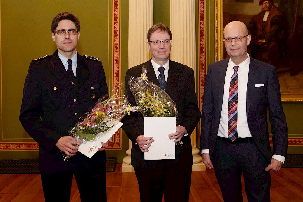Den mit 1.000 Euro dotierten Transferpreis in der Kategorie „Erfolgreiche regionale Transferkooperation", gestiftet von der Stadt Halle (Saale), erhielt das Kooperationsprojekt Hands2Help. Prof. Dr. Stefan Sackmann, Institut für Wirtschaftsinformatik, und sein Mitarbeiter Hans Betke sowie Dr. Robert Pulz, Abteilungsleiter Brand-, Katastrophenschutz und Rettungsdienst der Stadt Halle (Saale), arbeiten gemeinsam an der Entwicklung eines App-basierten Koordinationssystems für freiwillige Helfer.