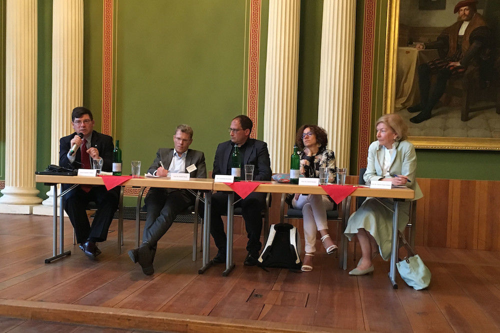 Im Anschluss an den Vortrag wurden diese Thesen auf einem Podium, das die Direktorin des Max-Planck-Instituts für ethnologische Forschung Halle Prof. Dr. Marie-Claire Foblets leitete, von Dr. Constantin Hruschka von der Universität München, Prof. Dr. Sylvie Sarolea von der Universität Leuven und Prof. Dr. Daniel Thym von der Universität Konstanz diskutiert. Dabei ging es unter anderem um die Frage, welche Rolle die Akzeptanz von Migration in der Gesellschaft spielt und ob der liberale menschenrechtliche Ansatz nicht eher dazu führt, dass kritische Stimmen die Oberhand gewinnen, weil viele Bürger eine staatliche Steuerung im Interesse der Gesellschaft erwarten. Kontrovers diskutiert wurde auch die Rolle der Medien, die eher zu Schwarz-Weiß-Darstellungen neigten und damit den sachlichen Diskurs erschwerten.