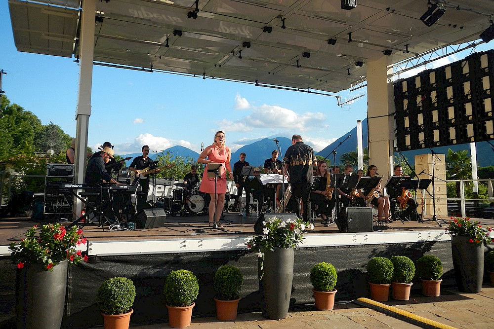 In der traumhaften Kulisse auf dem Thermenplatz von Meran, zwischen Bergen und Palmen, begeisterten wir gestern unser Publikum. Anfangs waren die Stuhlreihen noch recht übersichtlich besetzt, das änderte sich im Laufe des Konzertes schnell, sodass bald zahlreiche Interessierte mit Stehplätze vorliebnehmen mussten. Selbst die "Logen" auf den Balkonen des exklusiven Thermenhotels waren gut besetzt.