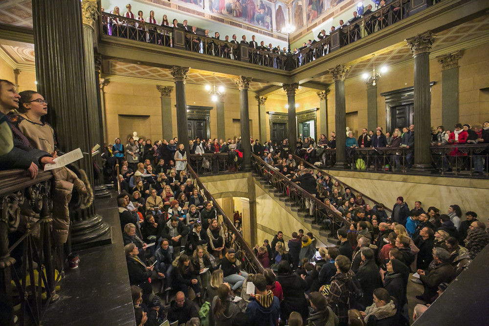 Jens Lorenz: Das Adventssingen bietet eine schöne Gelegenheit, vom Trubel der Vorweihnachtszeit loszulassen, weihnachtliche Musik zu hören und bekannte Lieder mitzusingen. Die Architektur des Löwengebäudes trägt außerdem dazu bei, dass der Gesang des Chors an diesem Abend ganz besonders klingt. Die Idee, ein für alle offenes Adventssingen zu veranstalten, trifft einen Nerv. Das spiegelt sich in den Besucherzahlen wider: Bei der ersten Aufführung im Jahr 2011 waren es noch rund 200 Gäste – 2017 schon fast viermal so viele.