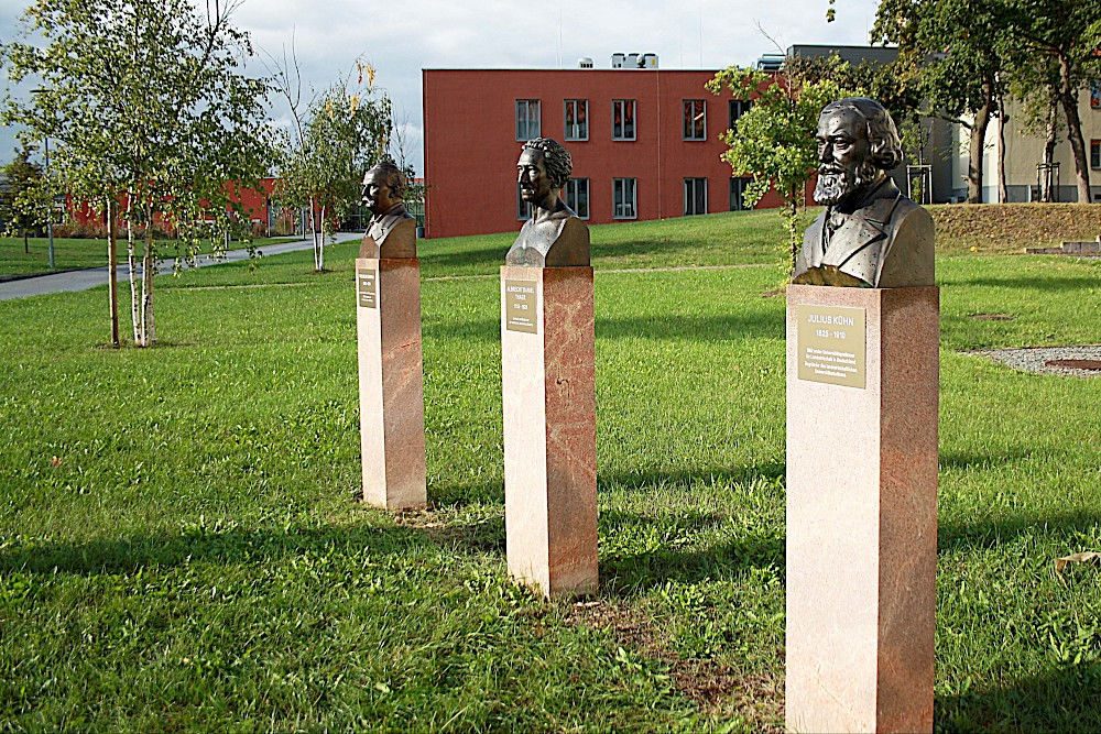Seit drei Jahren stehen die Bronzebüsten neben dem Hörsaalgebäude an der Theodor-Lieser-Straße, heute Morgen wurden die Infotafeln mit biographischen Daten zu Rimpau, Thaer und Kühn angebracht. Die Gesellschaft zur Förderung der Agrar- und Ernährungswissenschaften der Uni Halle e.V. hatte dafür entsprechende Plaketten anfertigen lassen. Im Beisein von Mitgliedern der Gesellschaft, Agrarwissenschaftlern und Kustoden der Universität wurden die Büsten eingeweiht.