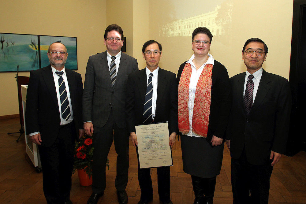 Vermittler zwischen Ost und West sind auch die sieben Absolventen des deutsch-japanischen Doppel-Masterstudiums der Universität Halle und Keio-Universität in Tokio. Im Beisein des Gesandten der japanischen Botschaft Takayiku Miyashita und Repräsentanten der Projektpartner erhielten sie gleich zwei Urkunden: Für den deutschen und für den japanischen Master-Abschluss. Das Elite-Austauschprogramm wird von der Robert Bosch Stiftung gefördert und gemeinsam mit der Studienstiftung des deutschen Volkes und den beiden Universitäten durchgeführt.