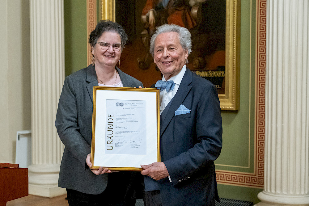 „Wir bedanken uns ganz herzlich für das Vertrauen“, sagte Katrin Rehschuh nach der Wahl. Sie selbst folgt auf den ehemaligen Kustos und Archivar der Universität Dr. Ralf-Torsten Speler, der sich seit vielen Jahren an der MLU engagiert – „ein halbes Jahrhundert für die Universität“, wie er selbst zuletzt im Titel seines autobiografischen Buches „Alles erlebt!“ schrieb. Der mittlerweile 79-Jährige gehörte bei der Wiedergründung der VFF nach der Wende bereits zu den Gründungsmitgliedern. Das Amt des zehnten Präsidenten in der Geschichte der Vereinigung übernahm er 2013 direkt nach seinem Eintritt in den Ruhestand. Rehschuh würdigte am Donnerstag sein unermüdliches Wirken. Sie verwies dabei zum Beispiel auf historisches Wissen über die Universität, das Speler in unzähligen Vorträgen, Publikationen und Führungen vermittelt hat, sowie sein herausragendes Engagement für das Deutschlandstipendium zur Förderung von Studierenden. Besonders ging sie auf die von ihrem Vorgänger verfasste Chronik zum 100-jährigen Bestehen der VFF ein. „Das Buch zeigt uns neben der Tatsache, dass es sich bei der VFF um die älteste Fördervereinigung an einer deutschen Universität handelt, auch auf, in welche großen Fußstapfen wir treten, die es nun auszufüllen gilt.“ Ihren Dank richtete Rehschuh sowohl an Speler als auch Dr. Bernd Redlich, der das Amt des Schatzmeisters innehatte. Beide traten nicht wieder zur Wahl an.