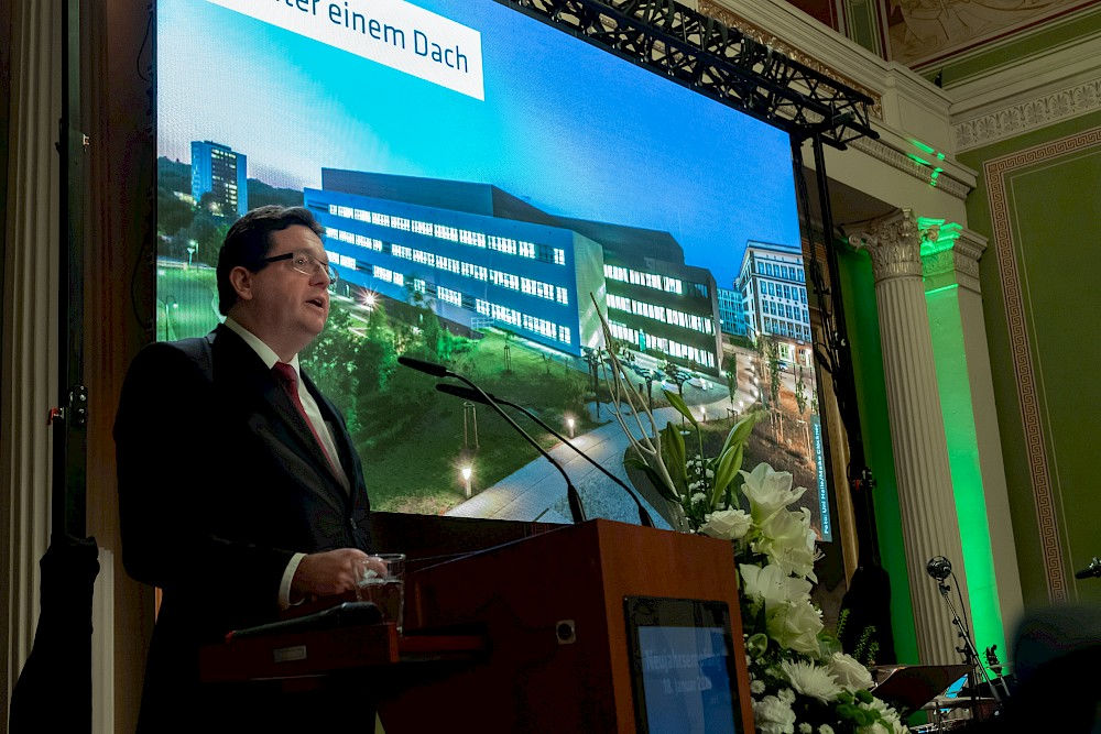 Der Rektor verwies nicht nur auf zahlreiche Höhepunkte des vergangenen Jahres von der Eröffnung des neuen Proteinzentrums über neue internationale Partnerschaften bis hin zur Verteidigung des Zertifikats audit familiengerechte Hochschule. Er nannte auch Erfolge in der Forschung wie die Hugo-Junkers-Preise für Wissenschaftler der Universität oder ein Drittmittelaufkommen der Uni von rund 48,5 Millionen Euro plus 12,5 Millionen Euro in der Medizin.