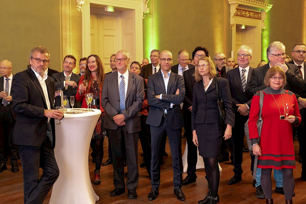 Es gab einige Premieren beim diesjährigen Neujahrsempfang. Da wäre zum Beispiel der Veranstaltungsort. Nicht im Hallischen Saal oder der Harz-Mensa, sondern in der altehrwürdigen Aula des Löwengebäudes wurden die Gäste – Vertreter aus Stadt, Wirtschaft, Wissenschaft, Land- und Bundestag sowie Uni-Angehörige – begrüßt. Neu war auch der Gastgeber: Christian Tietje ist seit dem 1. September 2018 im Amt des Rektors. Und er wartete auf seinem ersten Neujahrsempfang zugleich mit weiteren Premieren auf: die Einspielung eines kurzen Videos von der Investitur im Oktober oder die Einblendung von Fotos aus dem Uni-Leben des Jahres 2018 auf einer großformatigen LED-Wand über den gesamten Abend gehörten dazu. Auf Letzterer wurde auch die komplette Gästeliste abgebildet. Mit dem Verzicht auf die ausführliche Begrüßung jedes Einzelnen solle Zeit für Gespräche gespart werden, erklärte Tietje.