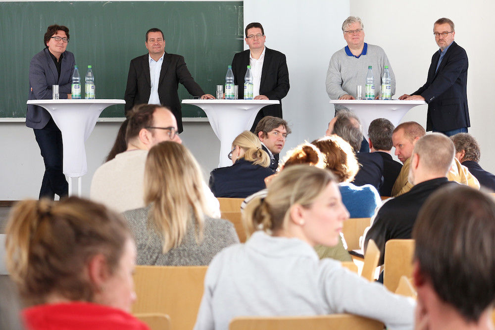 Nach ziemlich exakt zwei Stunden war die Premiere vorbei, Rektor Prof. Dr. Christian Tietje sprach von einem „guten Auftakt“. Zum ersten Mal hatte das neue Rektorat zu dem Gesprächsformat geladen, das in diesem Semester wöchentlich in einer anderen Fakultät stattfinden soll. Auf dem Podium standen dafür der Rektor, der Prorektor für Studium und Lehre Prof. Dr. Wolf Zimmermann, der Prorektor für Forschung Prof. Dr. Wolfgang Paul und Kanzler Markus Leber bereit. Neben Professoren und Mitarbeitern der Fakultät waren der Einladung auch viele Studierende gefolgt. Es gehe um den Dialog mit der Basis, betonte Tietje noch einmal.