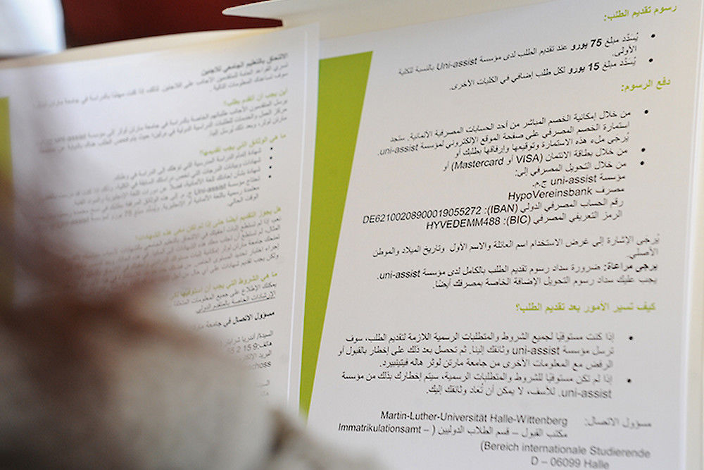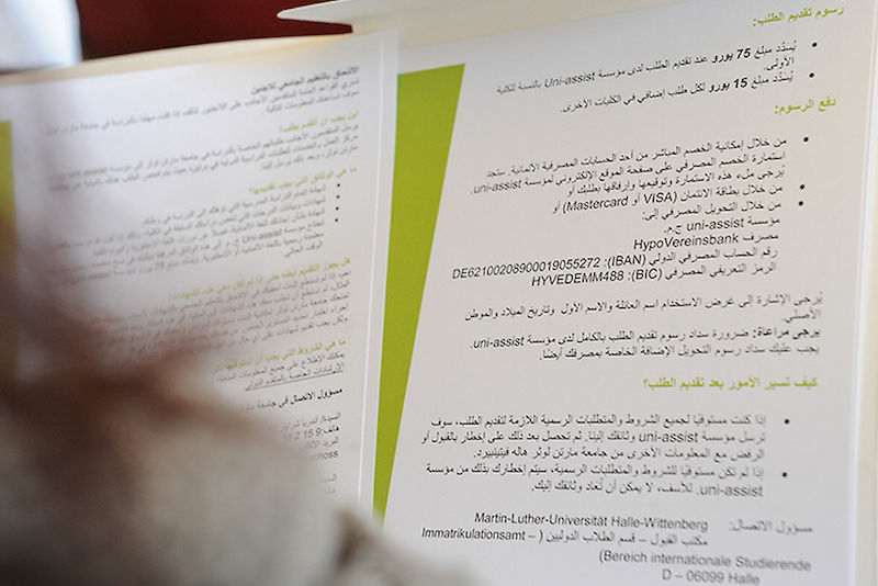 Erstmals gab es in diesem Jahr Info-Veranstaltungen speziell für Flüchtlinge: Auf Arabisch und Englisch, auf Französisch sowie auf Persisch informierten Uni-Mitarbeiter und Vertreter des Instituts für Deutsche Sprache über Deutschkurse, die Möglichkeit der Gasthörerschaft sowie über Zugangsvoraussetzungen für ein Studium. Das Interesse war groß.