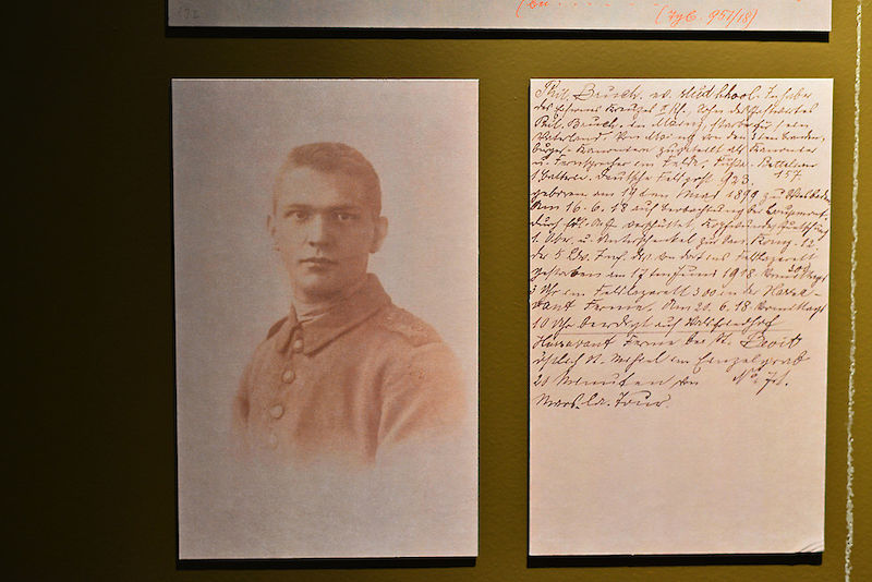Seine Briefe aus dem Feld sind zu großen Teilen erhalten geblieben und wurden später durch den Sohn als Buch veröffentlicht. Sie bestechen durch ihre einfachen Botschaften, eine klare Sprache, aber auch durch die Banalität und zugleich die Ungeheuerlichkeit des Geschriebenen. Ein Beispiel: „Mehr als Sterben kann man nicht.“ – Es sind verstörende Aussagen wie diese, die Historiker Michael Ruprecht zur Dokumentation der einzelnen Bereiche der Ausstellung ausgewählt hat. Mit ihnen, so Ruprecht, „lässt sich die Wirkung des Krieges auf den Einzelnen verdeutlichen.“