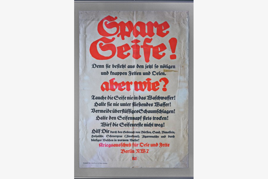 Aber auch eher banale Dinge finden sich in der Ausstellung, etwa ein Plakat, das zur damaligen Zeit in öffentlichen Einrichtungen, und damit auch an der Universität aushing: „Spare Seife“, steht da versehen mit einer Handlungsanweisung zum sparsamen Händewaschen. Absender war der Kriegsausschuss für Öle und Fette. Knapper werdende Ressourcen verraten auch diverse andere Mitteilungen, etwa eine, wonach die Vorlesungszeiten dem Tageslicht angepasst werden müssen, und eine andere, die den Anbau von Obst und Gemüse auf allen brachliegenden Flächen der Universität anordnet.