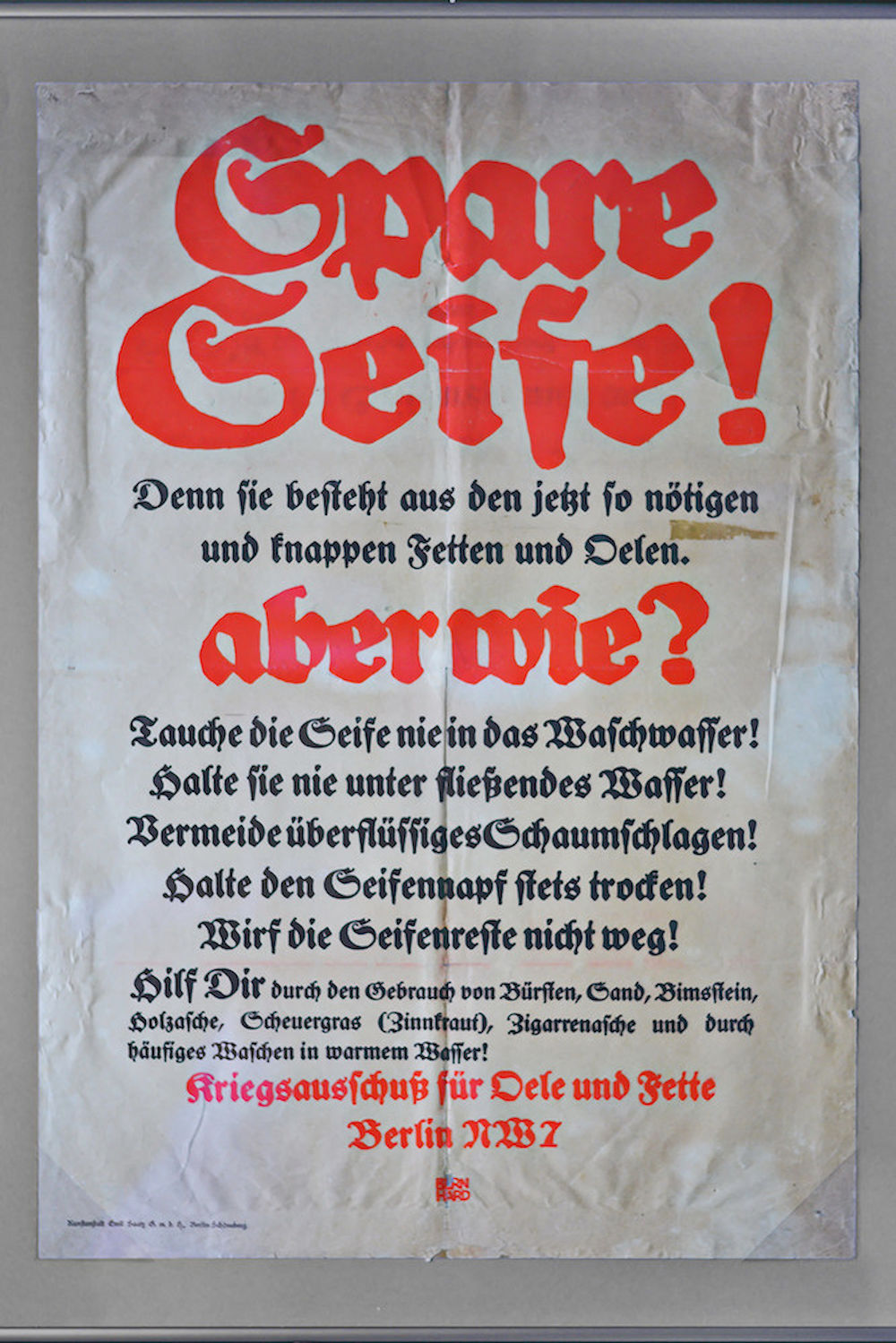 Aber auch eher banale Dinge finden sich in der Ausstellung, etwa ein Plakat, das zur damaligen Zeit in öffentlichen Einrichtungen, und damit auch an der Universität aushing: „Spare Seife“, steht da versehen mit einer Handlungsanweisung zum sparsamen Händewaschen. Absender war der Kriegsausschuss für Öle und Fette. Knapper werdende Ressourcen verraten auch diverse andere Mitteilungen, etwa eine, wonach die Vorlesungszeiten dem Tageslicht angepasst werden müssen, und eine andere, die den Anbau von Obst und Gemüse auf allen brachliegenden Flächen der Universität anordnet.