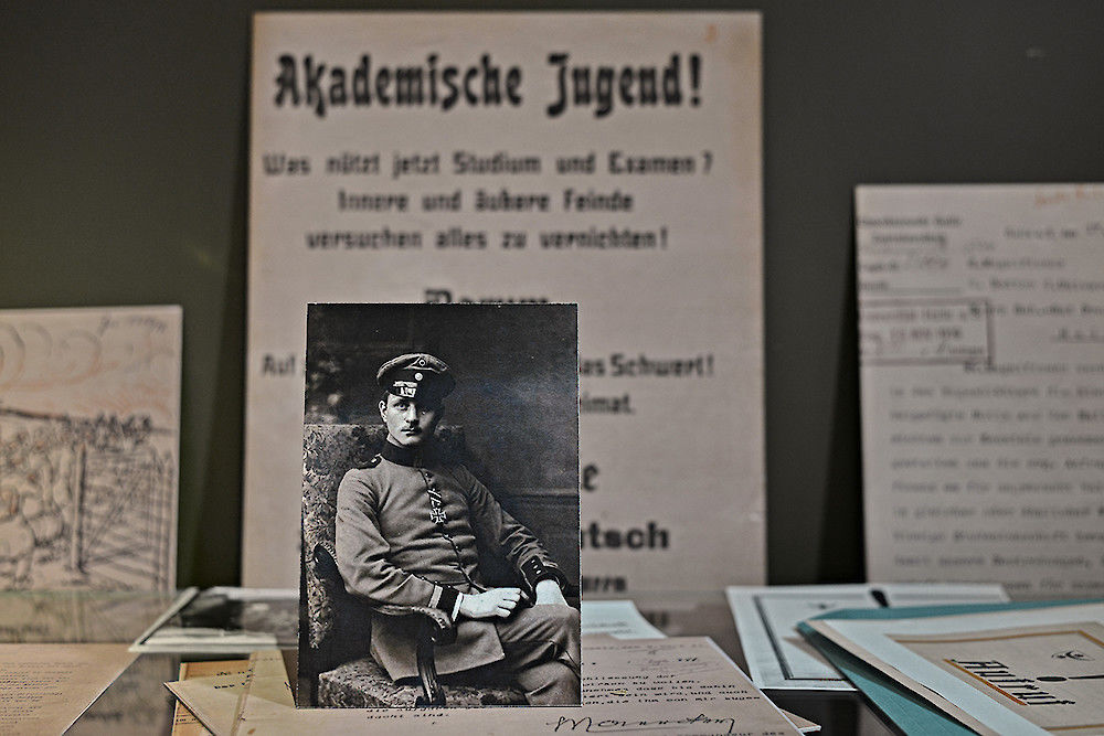 Zu sehen sind Fotos, Briefe, bürokratische Erlässe und universitärer Schriftverkehr sowie Plakate und Orden. Sie verdichten das von Universitätsarchivar Dr. Michael Ruprecht stammende Konzept der Ausstellung zu einem stimmigen Bild jener Zeit. Eine Zeit, in der die damals blühende und aufstrebende Universität durch den Krieg regelrecht amputiert wurde. Vor allem die in einem eigens für die Schau geformten Gang, der an einen Schützengraben erinnern soll, dargestellten Einzelschicksale sind es, die diese Diagnose eindrucksvoll verdeutlichen: Historische Fotos, wie das des Romanistik-Professors Karl Voretzsch, der sich freiwillig an die Front meldete und im Feld Motivationsvorträge für die Soldaten hielt.
