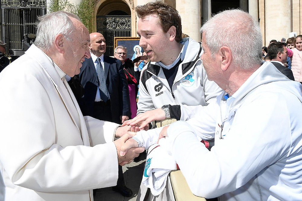 19. April auf dem Petersplatz in Rom: Daniel Neugebauer und Peter Junge vom Verein Friedenslauf von Rom 2017 treffen Papst Franziskus bei einer Generalaudienz. Sie bitten ihn, den rund 2.000 Kilometer langen Lauf von der italienischen Hauptstadt nach Wittenberg im Jahr des Luther-Jubiläums zu segnen. Über 40 Läufer, darunter Christen, Muslime und Hindus, brechen am 23. April vom Vatikan in Richtung Sachsen-Anhalt auf.