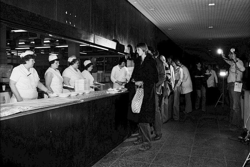 Zu DDR-Zeiten war die Weinberg-Mensa vor allem auf Masse angelegt. Rund 5.000 Essen wurden täglich zubereitet, mehr als 100 Angestellte kochten auch für Betriebe, Schulen und Kindergärten, die das Essen dann in Kübeln geliefert bekamen. Der Nachteil: Vieles war vorgefertigt und das Essen war weniger frisch und durch die langen Wege auch weniger schmackhaft.