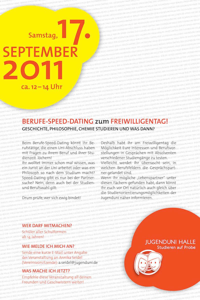 Am 17. September veranstaltet der studentische Verein "Jugenduni Halle"im Rahmen des Freiwilligentages der Freiwilligen-Agentur Halle-Saalekreis von 12 bis 14 Uhr ein Treffen für Schüler aller Schulformen (ab 14 Jahre), die an diesem Tag mit ehemaligen Studenten in Kontakt treten können. Im Mittelpunkt steht dabei, ihnen Wissen zum Leben und Arbeiten nach dem Studium zu vermitteln und ihnen die Wahl für den eigenen Traumberuf und die passende Studienrichtung zu erleichtern.