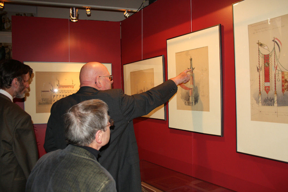 Jeden Tag begleiten die Sinnbilder der vier Fakultäten – Theologie, Jurisprudenz, Medizin und Philosophie – in Form von Wandfriesen die Studenten, wenn sie im Löwengebäude Seminare und Vorlesungen besuchen. Die dazugehörigen Entwurfszeichnungen von Gustav Adolf Spangenberg werden in der Ausstellung gezeigt und lassen die Entstehung erahnen. Doch die Schau zeigt noch viel mehr Zeugnisse der Zeit, wie die Baupläne, den fantastischen Schmuck des Hauptgebäudes anlässlich der 200-Jahr-Feier oder die Baugrube während des Umbaus durch die Nationalsozialisten. Die rund 200 Exponate geben erstmalig einen umfassenden und bunten Einblick in alle wichtigen graphischen Darstellungen des Hauptgebäudes, von der Entstehung bis zur Gegenwart. Sie werden durch Gemälde und Bildnisporzellane sowie Ansichten auf Steinzeug und Glas des 19. Jahrhunderts, aber auch Mobiliar ergänzt.