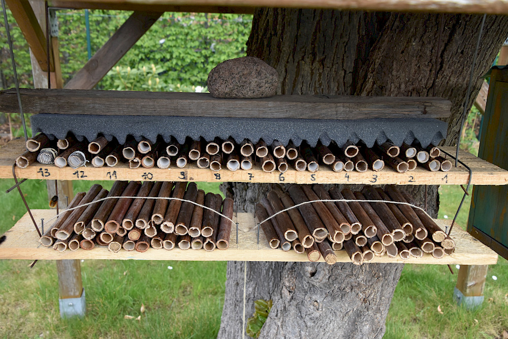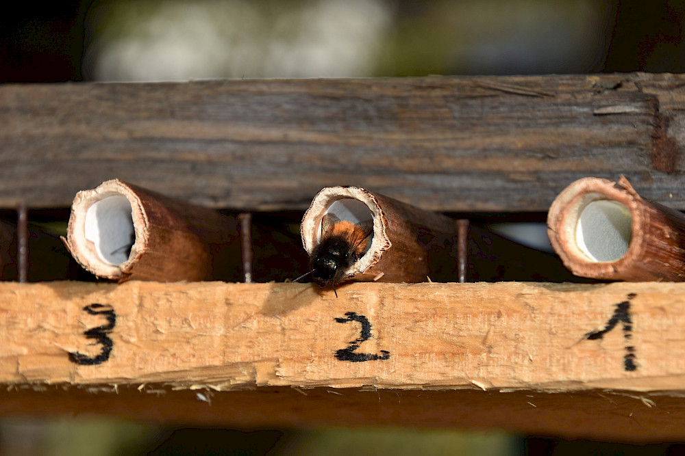 Wenn die Bienen ihre Nester anfliegen, orientieren sie sich zunächst rein visuell, wie Frahnert beobachten konnte: „Wenn man Niströhren vertauscht, fliegt die Biene erstmal den vertrauten Platz an, steckt ihren Kopf in das Röhrchen und kriecht dann wieder heraus – weil der Geruch nicht stimmt. Sie fliegt dann die Nester in der Nachbarschaft ab und steckt überall den Kopf hinein, solange bis sie ihre eigene Brutzelle wiedergefunden hat.“