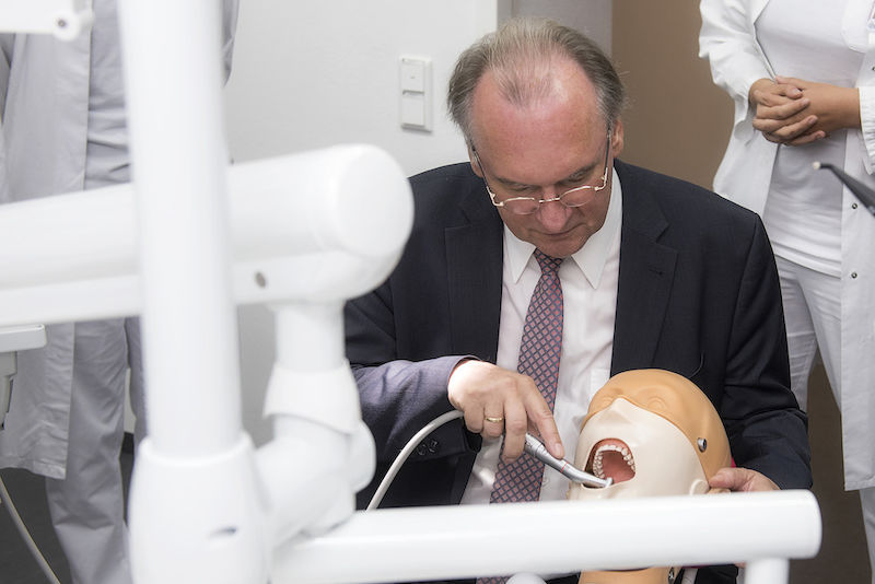 Ministerpräsident Haseloff sprach in seinem Grußwort davon, dass man stolz auf die neue Klinik und das Erreichte sein könne und gab dem anwesenden Oberbürgermeister Wiegand mit auf den Weg, die Zahnklinik als Standortfaktor zu nutzen. Er konnte sich aber auch einen kleinen, als Bitte formulierten Seitenhieb nicht verkneifen: „Bitte schließen Sie ausreichend Versicherungen ab“, denn so eine große Summe Geld würde man so schnell kein zweites Mal zusammenbekommen. Daran schloss sich zudem seine Bitte an den Dekan und den Ärztlichen Direktor an, dafür zu sorgen, die Studierenden und Absolventen auch im Land zu halten. „Kaum eine medizinische Richtung ist so existenziell für eine Lebensqualität wie die Zahngesundheit“, sagte Haseloff.
