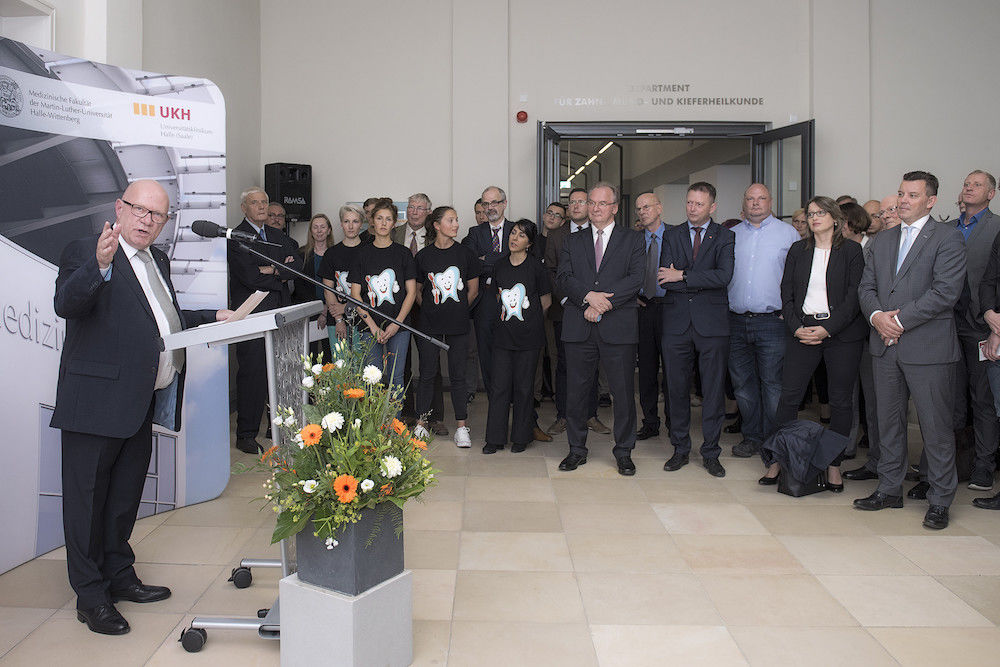 Daran erinnerten der Ärztliche Direktor des Universitätsklinikums Halle PD Dr. Thomas Klöss, Ministerpräsident Haseloff, der Dekan der Medizinischen Fakultät Prof. Dr. Michael Gekle, der Vizepräsident der sachsen-anhaltischen Zahnärztekammer Maik Pietsch, die Präsidentin der Ärztekammer Dr. Simone Heinemann-Meerz und der Chef des Departments für Zahn-, Mund- und Kieferheilkunde Prof. Dr. Hans-Günter Schaller in ihren Reden.