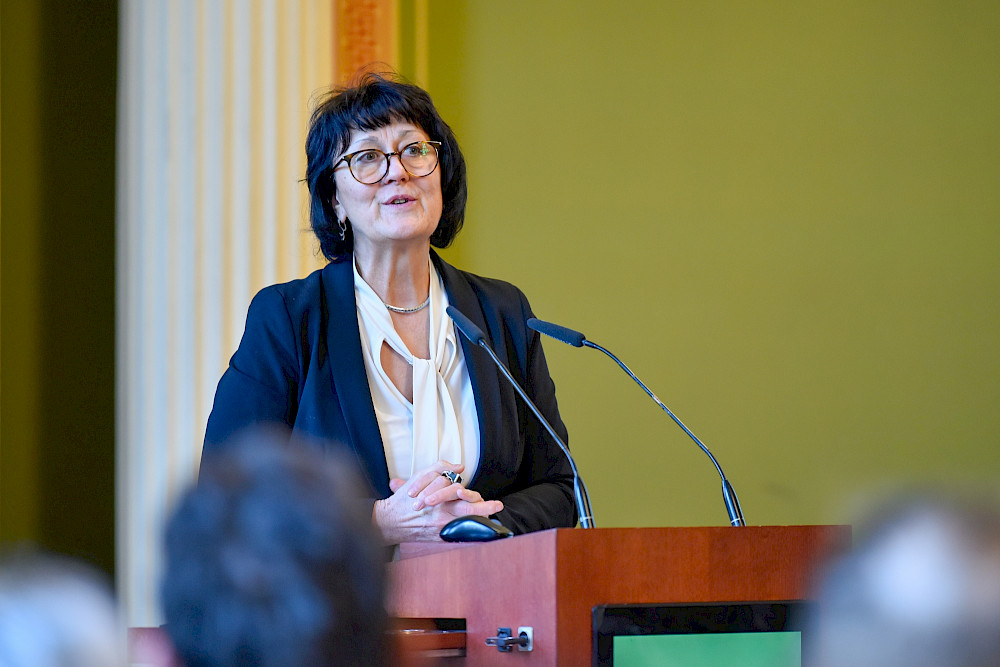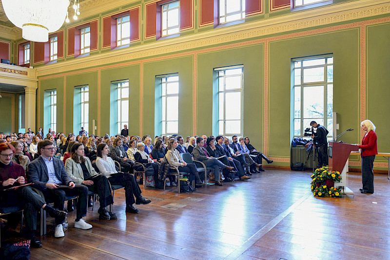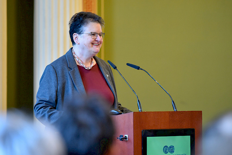 Rektorin Claudia Becker betonte in ihrem Grußwort den hohen Stellenwert, den die Lehrerbildung an der MLU innehat: „Die Universität ist für die grundständige Lehramtsausbildung im Land verantwortlich. Wir fühlen uns der Gesellschaft verpflichtet und übernehme diese wichtige Aufgabe gerne.“ Besonders erfreut zeigte sich die Rektorin darüber, dass Ministerin Feußner für die Feierstunde für die Absolventinnen und Absolventen persönlich angereist war. „Das zeigt uns allen, wie wichtig Sie für unser Land und die Gesellschaft sind.“