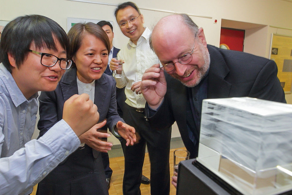 Drei Stunden hatte die chinesische Delegation eingeplant, um sich mit den Hydro- und Umweltgeologen der Uni Halle über den Stand der 3D-Modellierung geologischer Untergründe auszutauschen. Prof. Dr. Michael Bron, Prorektor für Forschung und wissenschaftlichen Nachwuchs, begrüßte die Besucher, zu denen auch Leiter zahlreicher geologischer Forschungseinrichtungen und Vertreter der größten Universität der Geowissenschaften Chinas gehörten.