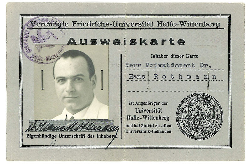 Hans Rothmann’s biography is identical in one point with at least 42 other professors in Halle. They were all suspended from the University of Halle between 1933 and 1945. Today we know of 41 men and two women. Not all of them bore the title of professor. The widely respected Hebrew lector Mojzis Woskin-Nahartabi, murdered in Auschwitz in 1944, and the medical assistant Georg Jacoby, who was forced to leave for “political reasons based on race”, are two examples of the unknown number of employees who were dismissed and students who were expelled.