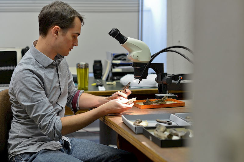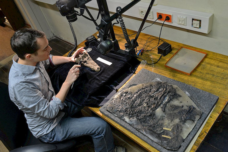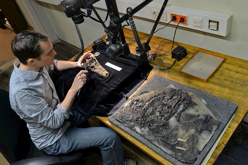 “I wanted to do research in Europe because palaeontology has its roots here,” Hastings explains. At the same time, the Central Repository of Natural Science Collections (ZNS), home to the Geisel Valley Collection, was looking for an international expert. They wanted a reptile expert who was preferably from a country whose palaeontologists use state-of-the-art methods. “We would like to see more internationally published articles on the Geisel Valley of the Eocene Epoch,” says Dr. Frank Steinheimer, head of ZNS. Alexander Hastings was able to fulfil all of these criteria. The post-doc, who was fascinated by dinosaurs early on as a child, specialises in Eocene fossils. He was a co-discoverer and the first to characterise a giant boa and five new species of crocodile. He has attracted the attention of the scientific community, among other ways, through publication in the journal “Nature”.