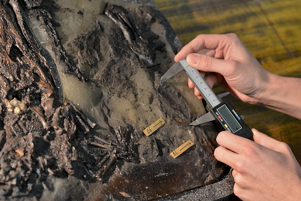Hastings has carried out important preliminary work with the help of custodian Meinolf Hellmund. He has created a digital map of the places around the female reptile where the fossils were discovered. He has also read about the ecosystem and climate conditions that were prevalent during the period in question in the Geisel Valley, and has examined the influences to which the animal was exposed. He has investigated fossil evidence of brood care and examined the fossil to determine its cause of death. His findings will appear in the journal Palaios in 2015. In his article, Hastings concludes that, in the case of GMH 6074, a drop in temperature was most likely the cause of death. Crocodiles are particularly sensitive to fluctuations in temperature. Because they are cold-blooded animals, a cold climate directly affects their body temperature. “As it got colder, the female apparently tried to maintain the temperature of her eggs for as long as possible,” says Hastings.
