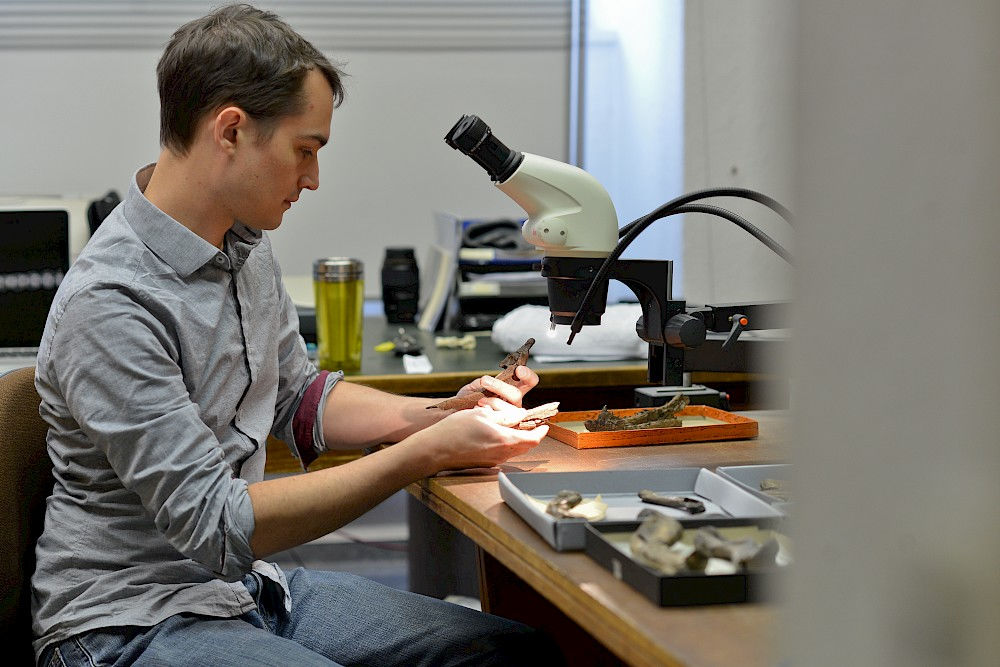 Hastings came to Halle in June 2013 for one and a half years as a fellow of the German Federal Cultural Foundation. His stay was extended by six months thanks to follow-up funding. He received an additional 200,000 euros from the Volkswagen Foundation in December 2014 in order to study, characterise and catalogue additional Geisel Valley finds as part of the initiative “Research in Museums”. In the past, the post-doc carried out research at the Florida Museum of Natural History and helped organise exhibits for a wide audience. The contrast between this and his new workplace at the New Residence - which was built in 1531 - couldn’t be greater.